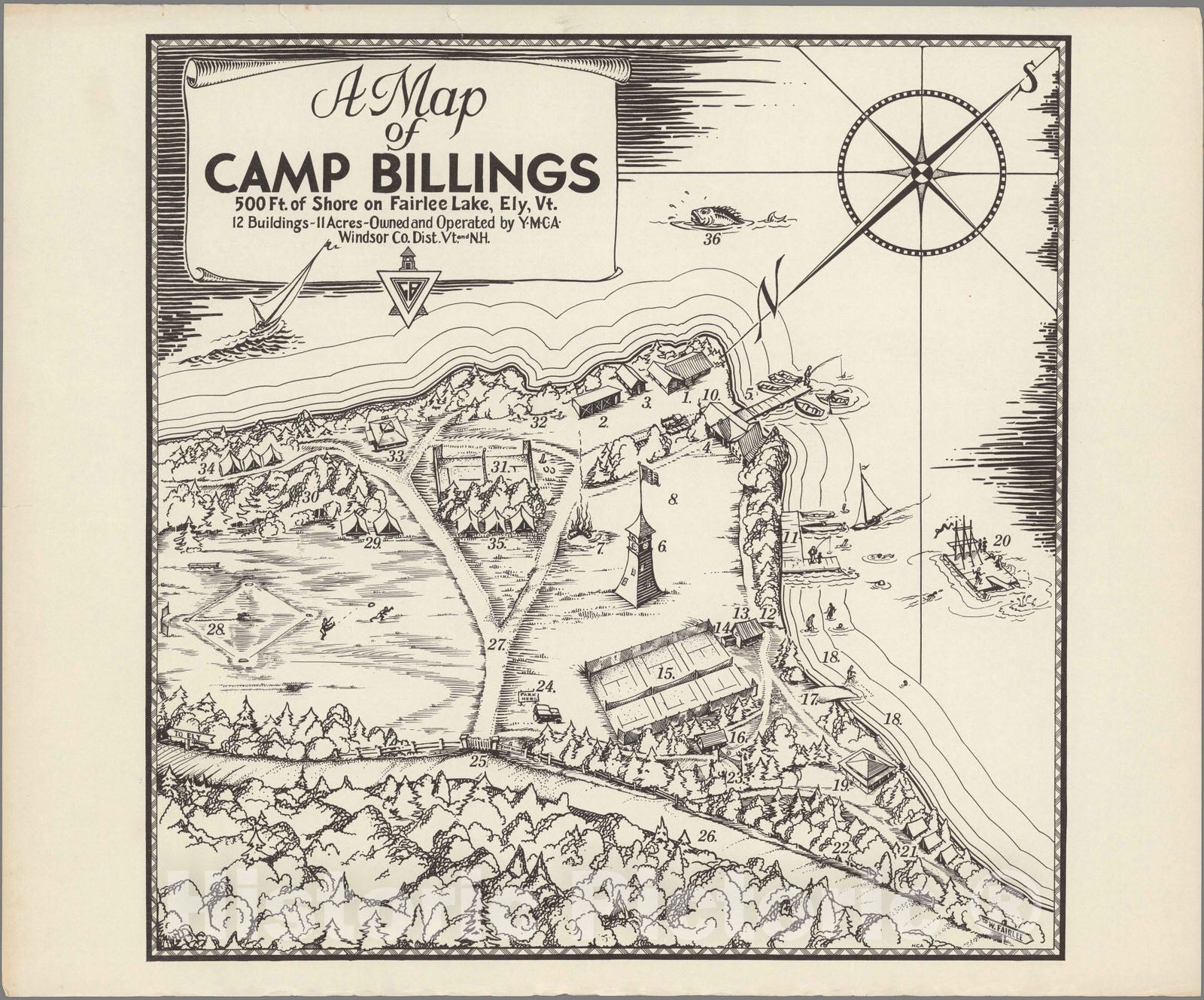 A map of Camp Billing. 500 Ft. Shore on Fairlee Lake, Ely, Vt. 12 buldings - 11 Acres-owned and operated by Y.W.C.A. Windsor Co. Dist., Vt. and N.H. | A map of Camp Billing. 500 Ft. Shore on Fairlee Lake, Ely, Vt. 12 buldings - 11 Acres-owned and operated by Y.W.C.A. Windsor Co. Dist., Vt. and N.H. |