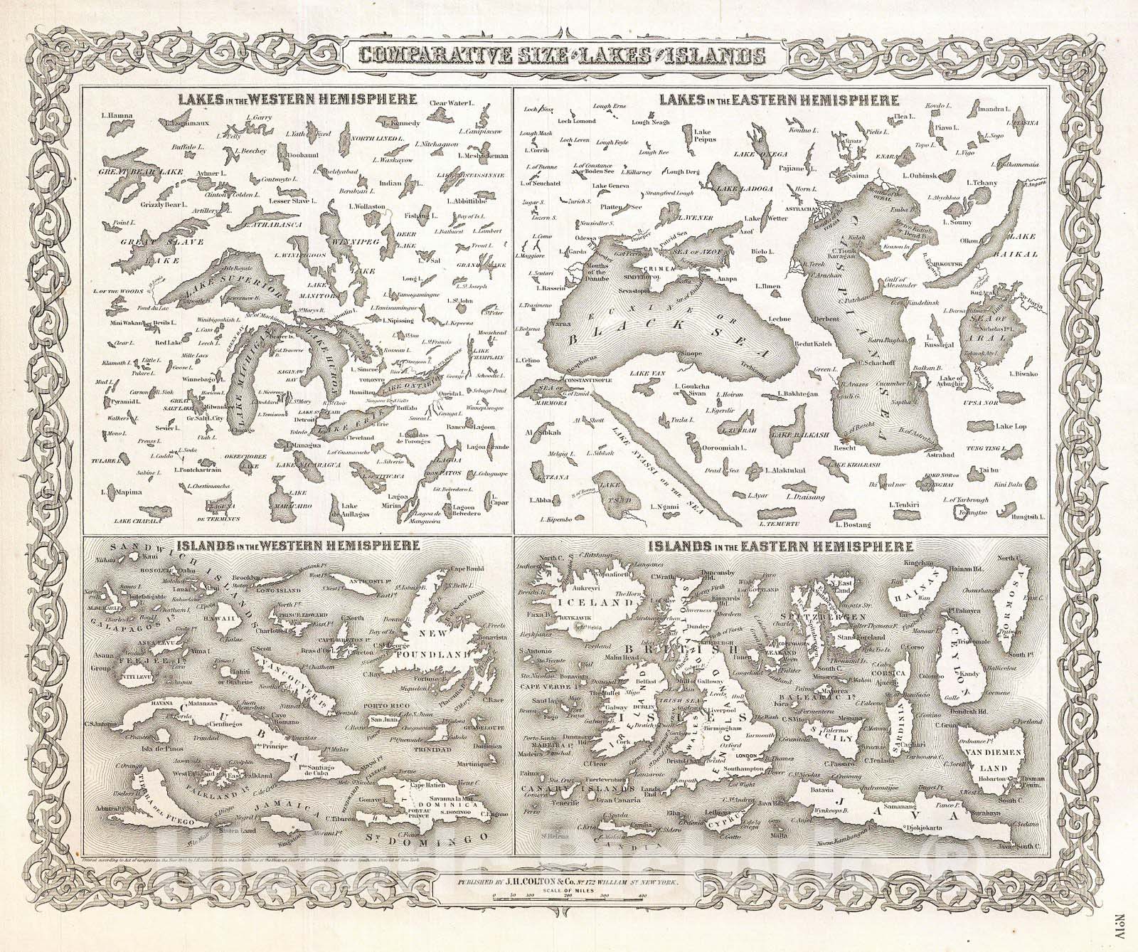 A beautiful 1855 first edition example of Colton's curious topical chart of the world's great islands and lakes. Divided into lakes and islands of the Eastern and Western Hemispheres. Curiously does not include Greenland - who's northern limits had not been explored when this map was printed. Colton does however include Laky Nyassi on the Sea - a large lake in Africa that was, at his point in history, still largely speculative with regard to its size and orientation. Most today associate Colton's Nyassi with Lake Malawi. Surrounded by Colton's typical spiral motif border. Dated and copyrighted to J. H. Colton, 1855. Published from Colton's 172 William Street Office in New York City. Issued as page no. IV in volume 2 of the first edition of George Washington Colton's 1855 Atlas of the World .