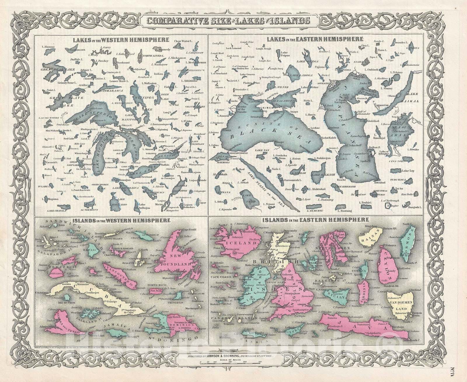 • .Historic Map : Comparative Chart of The World's Islands and Lakes, Colton, 1855, Vintage Wall Art