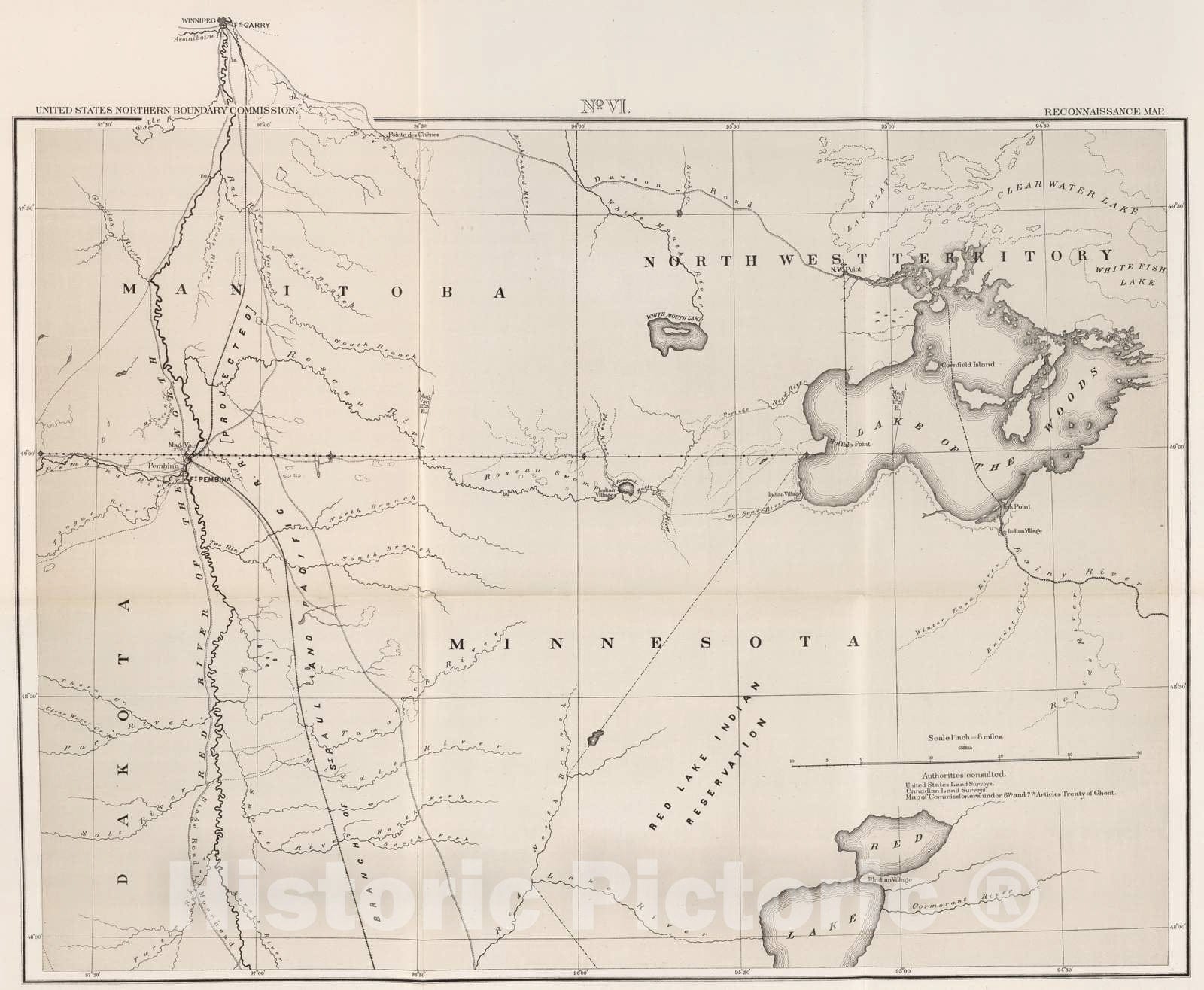 Historic Map : Exploration Book - 1878 No. VI, Reconnaissance Map. (Lake of The Woods to Ft. Pembina). - Vintage Wall Art