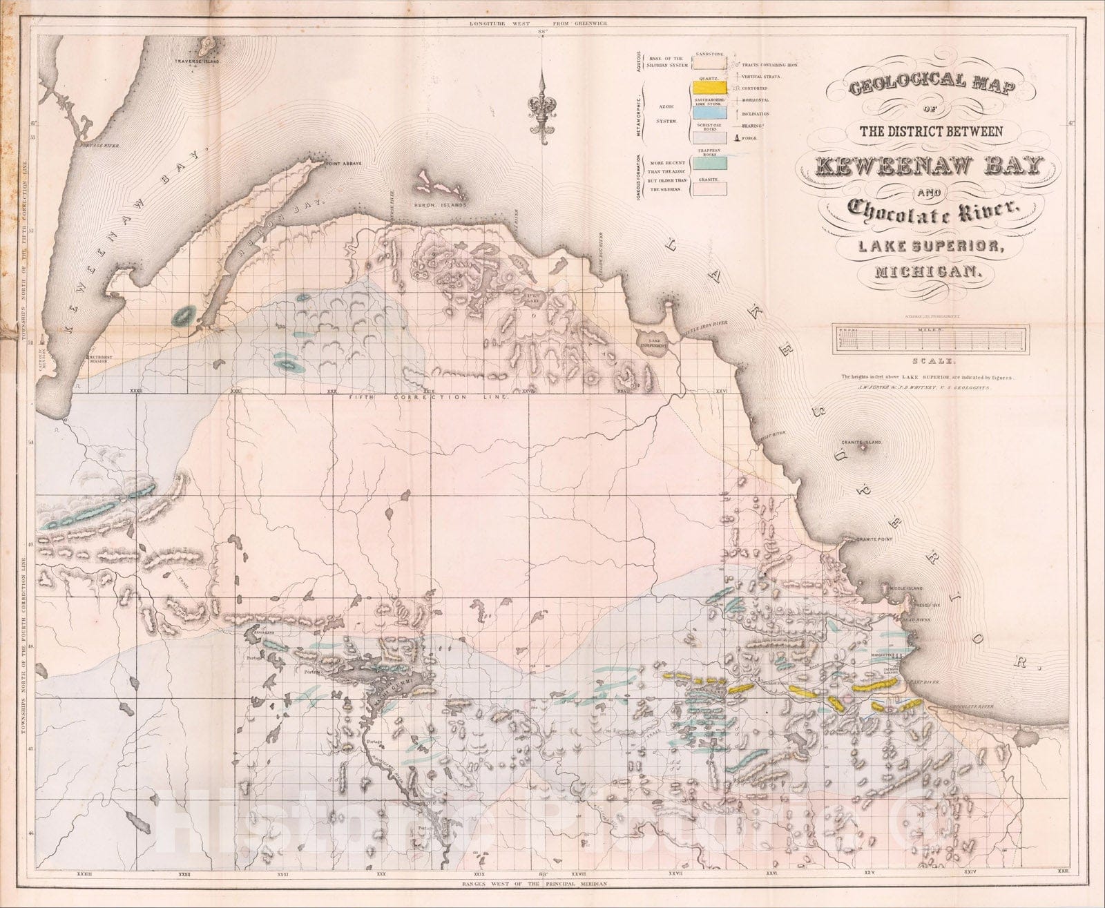 Historic Map : Geological Map of The District Between Keweenaw Bay and Chocolate River, Lake Superior, Michigan, 1849, Josiah Dwight Whitney, Vintage Wall Art