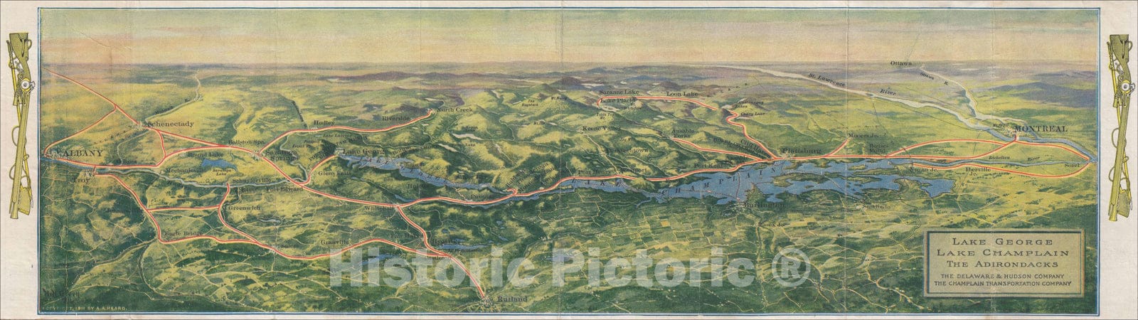 • .Historic Map : Green Bird's Eye View of Lake George, Lake Champlain, and the Adirondacks, 1916, Anonymous, Vintage Wall Art