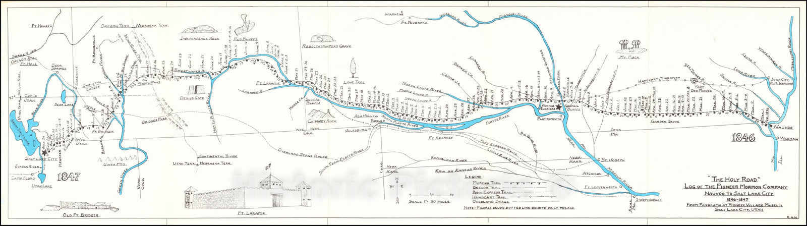 Historic Map : The Holy Road, Log of the Pioneer Mormon Company Nauvoo to Salt Lake City, c1970, Robert A. Hanson, Vintage Wall Art