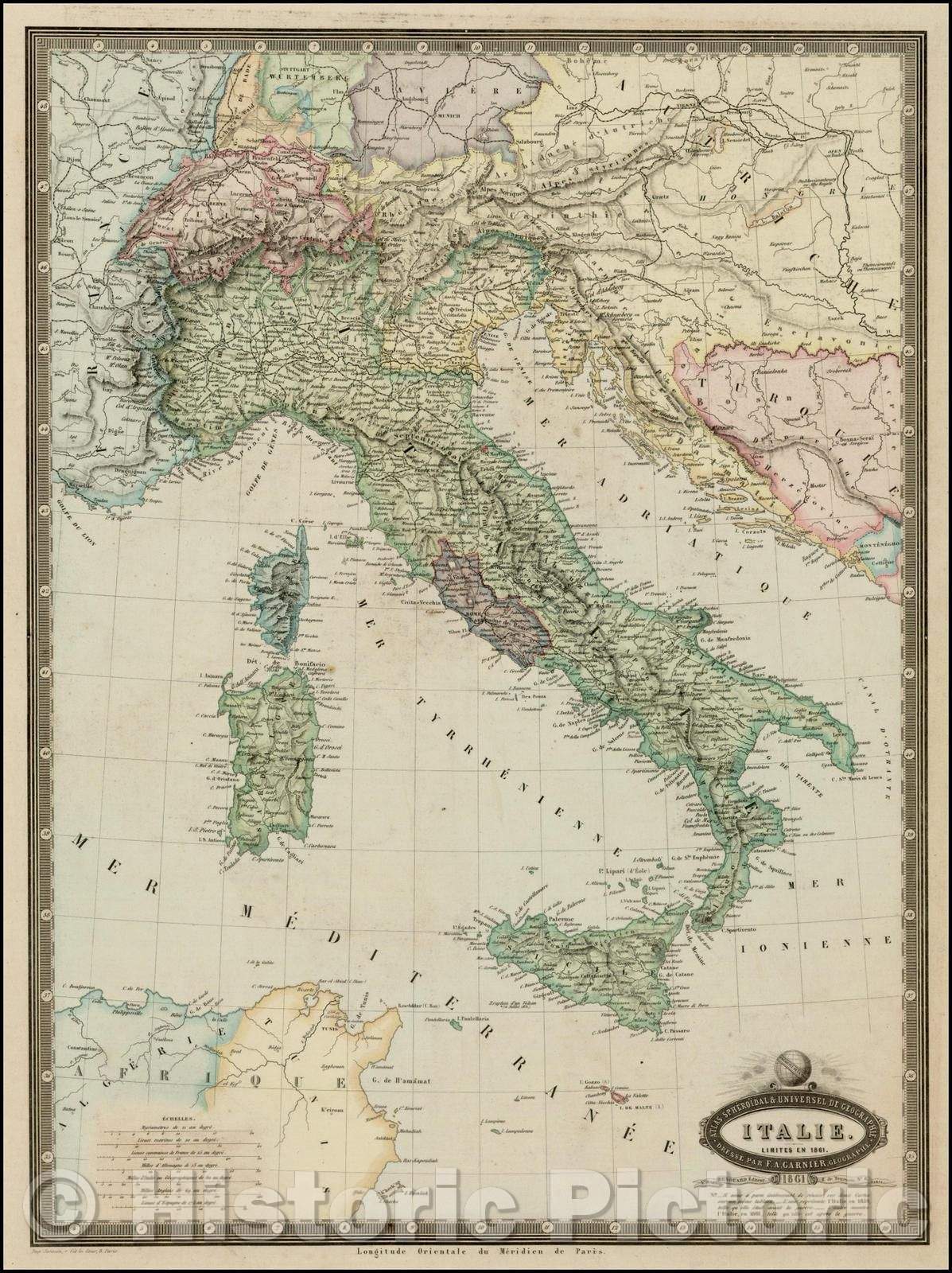 Historic Map - Italie Limites En 1861 / Map of Italy, showing kingdoms, towns, rivers, mountains, lakes, 1861, F.A. Garnier - Vintage Wall Art