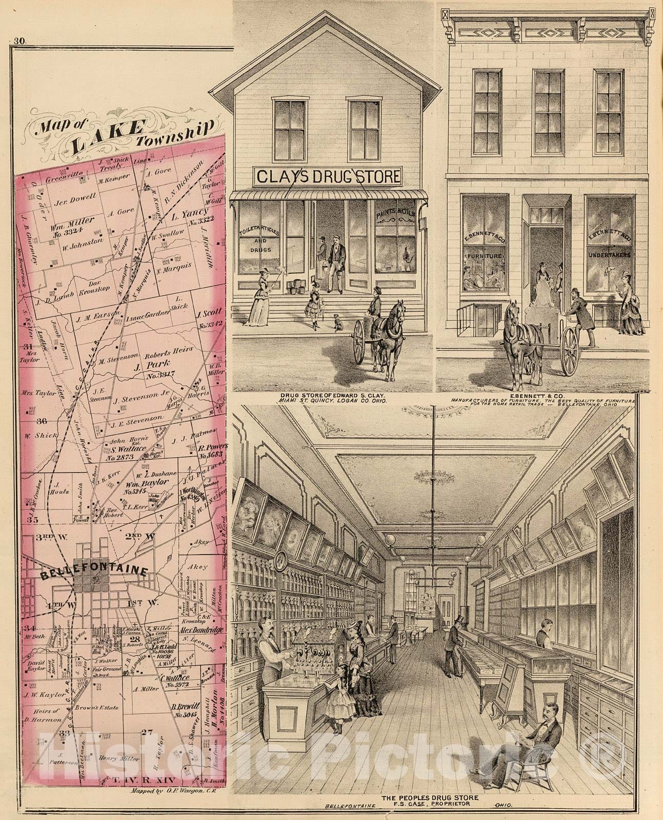 • .Historic Map : Lake Township, Logan County, Ohio. Properties of Edward S. Clay, E. Bennett & Co., and F.S. Case., 1875, Vintage Wall Decor
