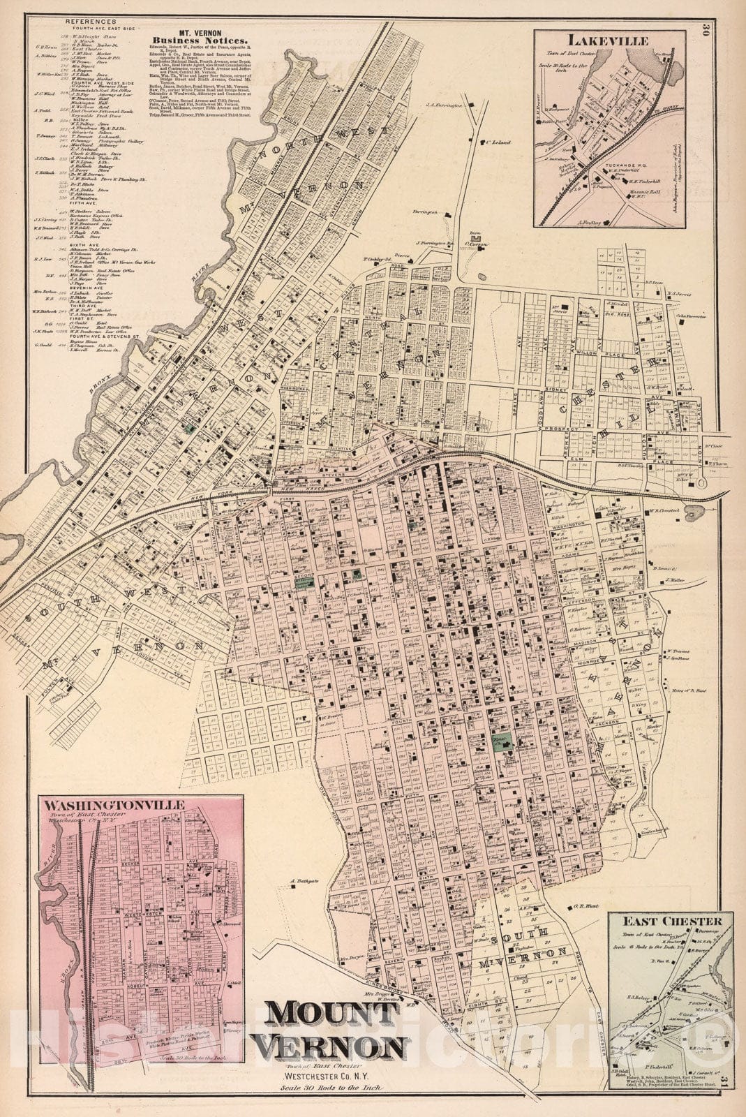• Historic Map : Mount Vernon, Town of East Chester, Westchester Co., N.Y. (insets) Washingtonville. East Chester. Lakeville., 1872, Vintage Wall Art