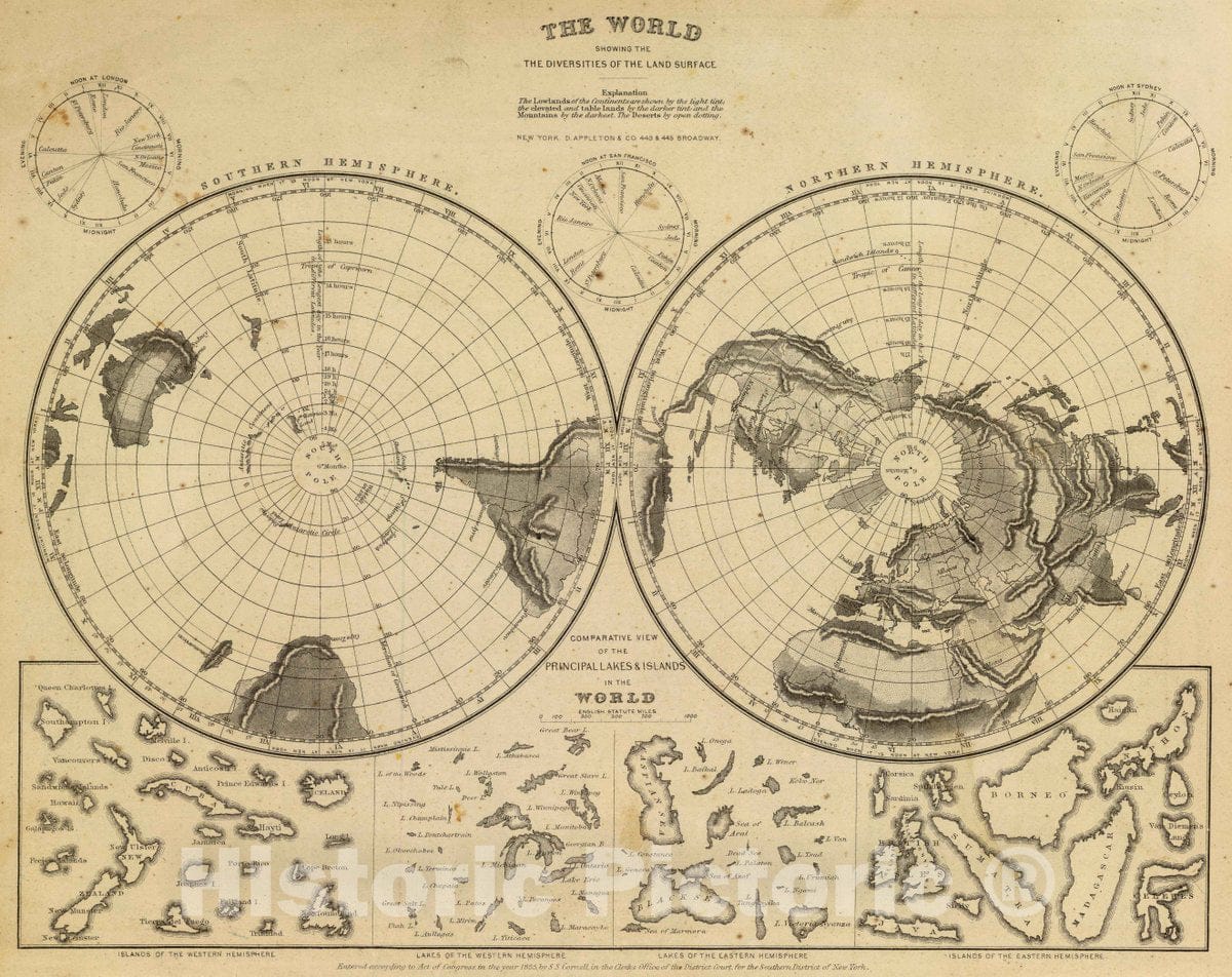 Historic Map : The World Showing The Diversities of The Land Surface. (with) Comparative View of The Principal Lakes & Islands in The World, 1864 Atlas - Vintage Wall Art