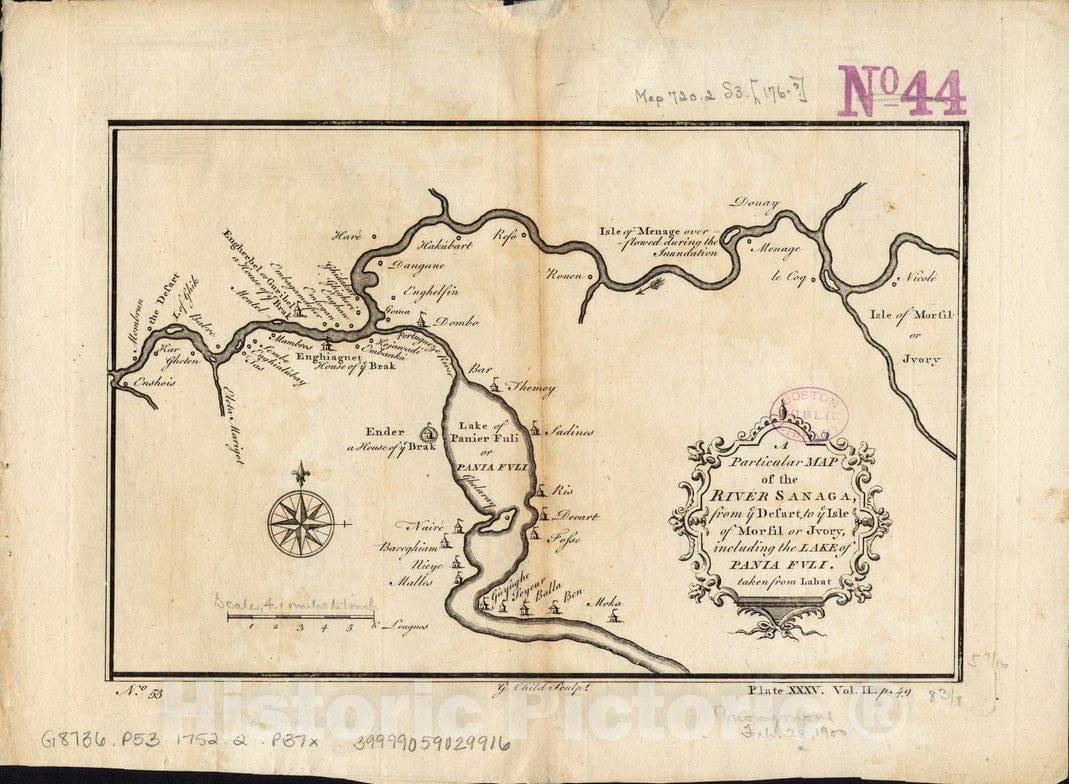 Historical Map, 1752 A Particular map of The River Sanaga, from ye desart, to ye Isle of Morfil or Jvory, Including The Lake of Pania Fuli, Vintage Wall Art