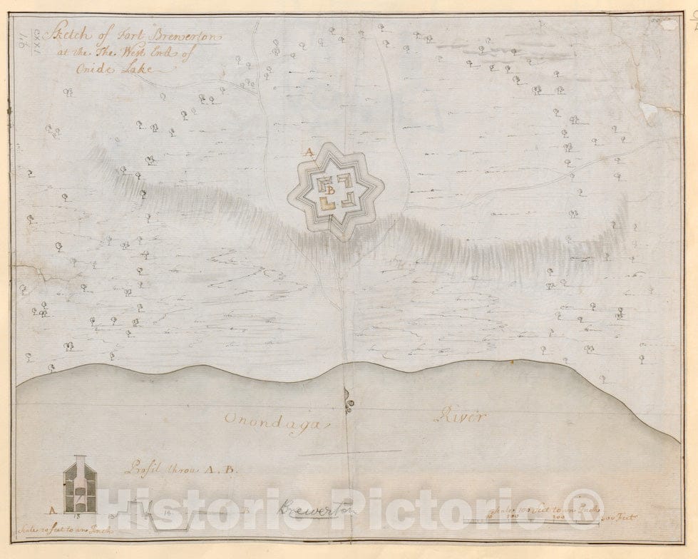 Historical Map, 1759 Sketch of Fort Brewerton at The The West End of Onide Lake, Vintage Wall Art
