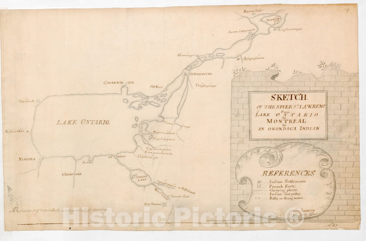 Historical Map, 1759 Sketch of The River S.T Lawrence from Lake Ontario to Montreal by an Onondaga Indian, Vintage Wall Art