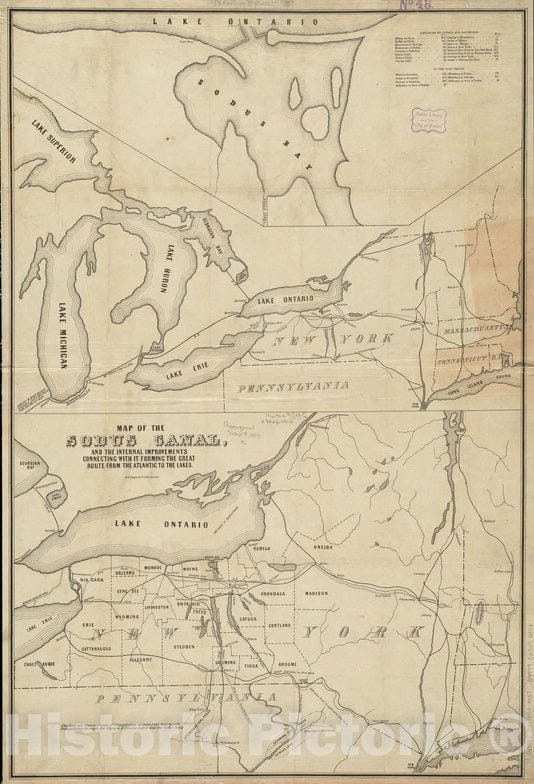 Historical Map, 1850-1859 Map of The Sodus Canal, and The Internal improvements Connecting with it Forming The Great Route from The Atlantic to The Lakes, Vintage Wall Art