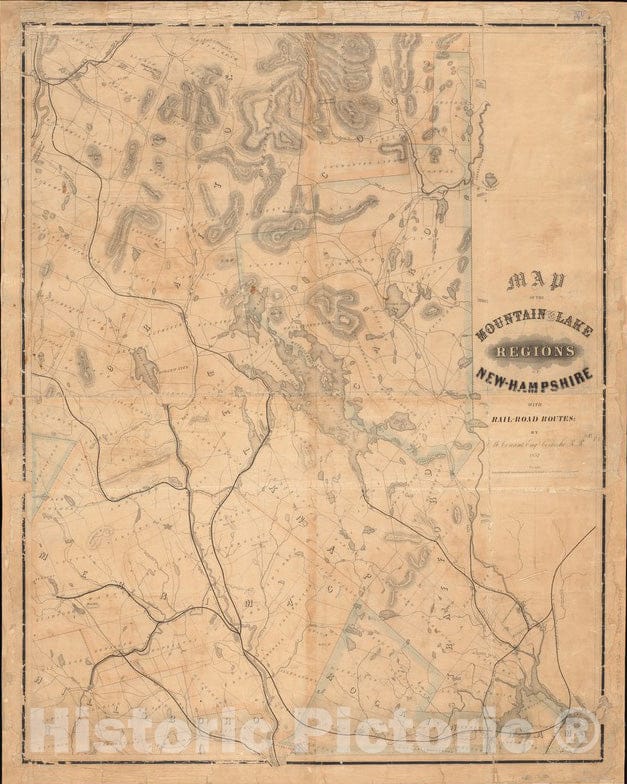 Historical Map, 1852 Map of the mountain and lake regions of New-Hampshire with rail-road routes, Vintage Wall Art
