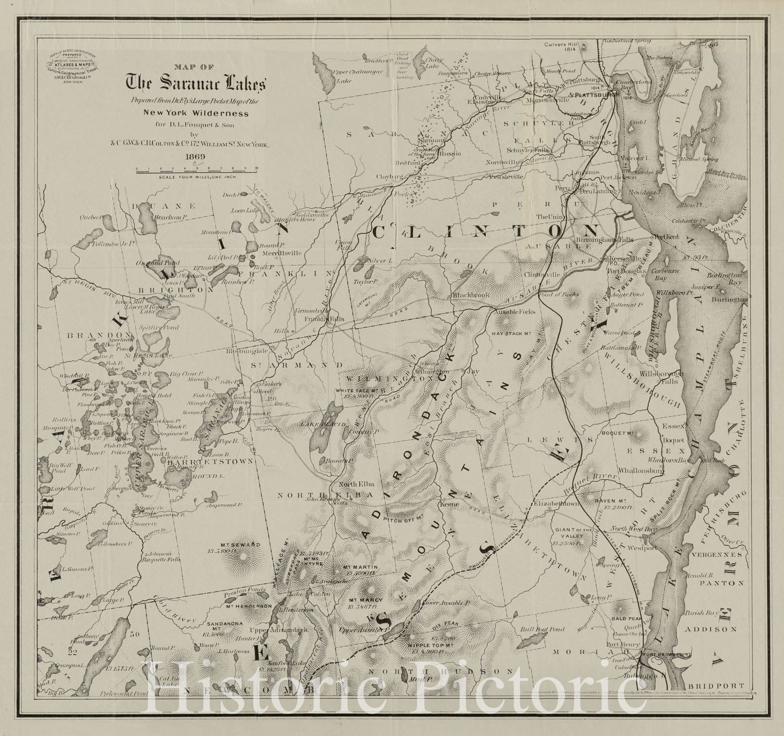 Historical Map, 1869 Map of the Saranac Lakes : prepared from Dr. Ely's large pocket map of the New York wilderness for D.L. Fouquet & Son, Vintage Wall Art
