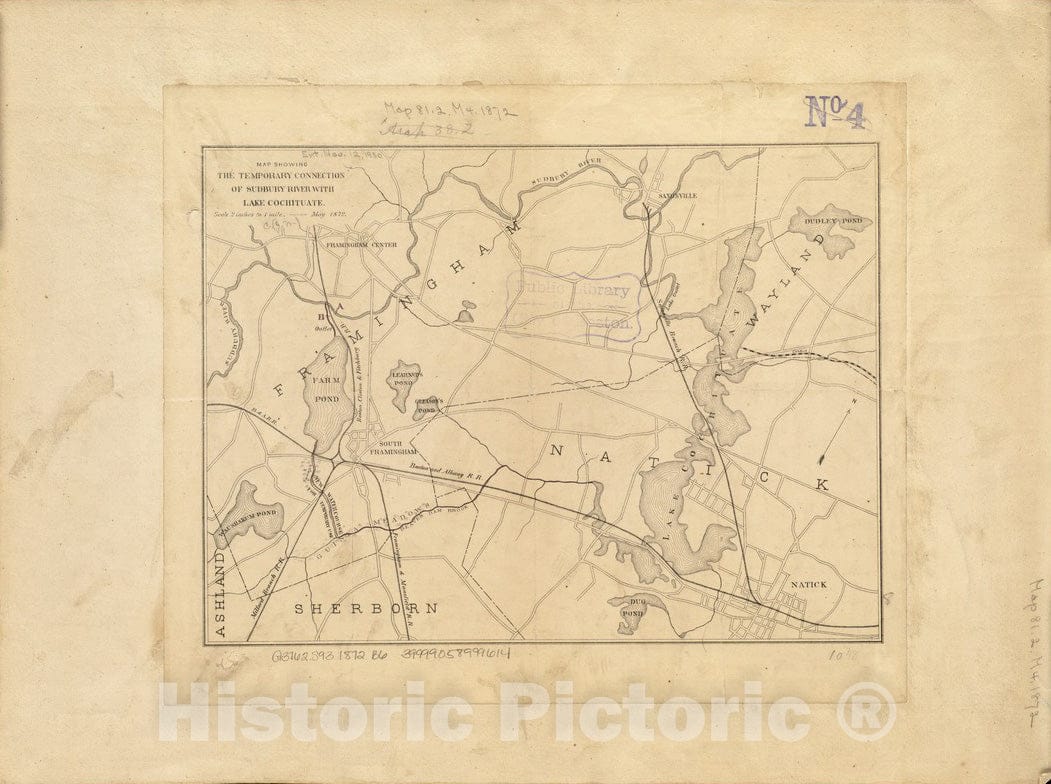 Historical Map, 1872 Map Showing The Temporary Connection of Sudbury River with Lake Cochituate, Vintage Wall Art