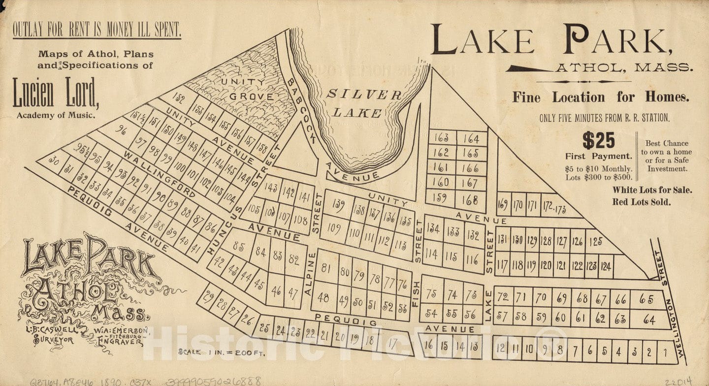 Historical Map, 1890 Lake Park, Athol, Mass, Vintage Wall Art