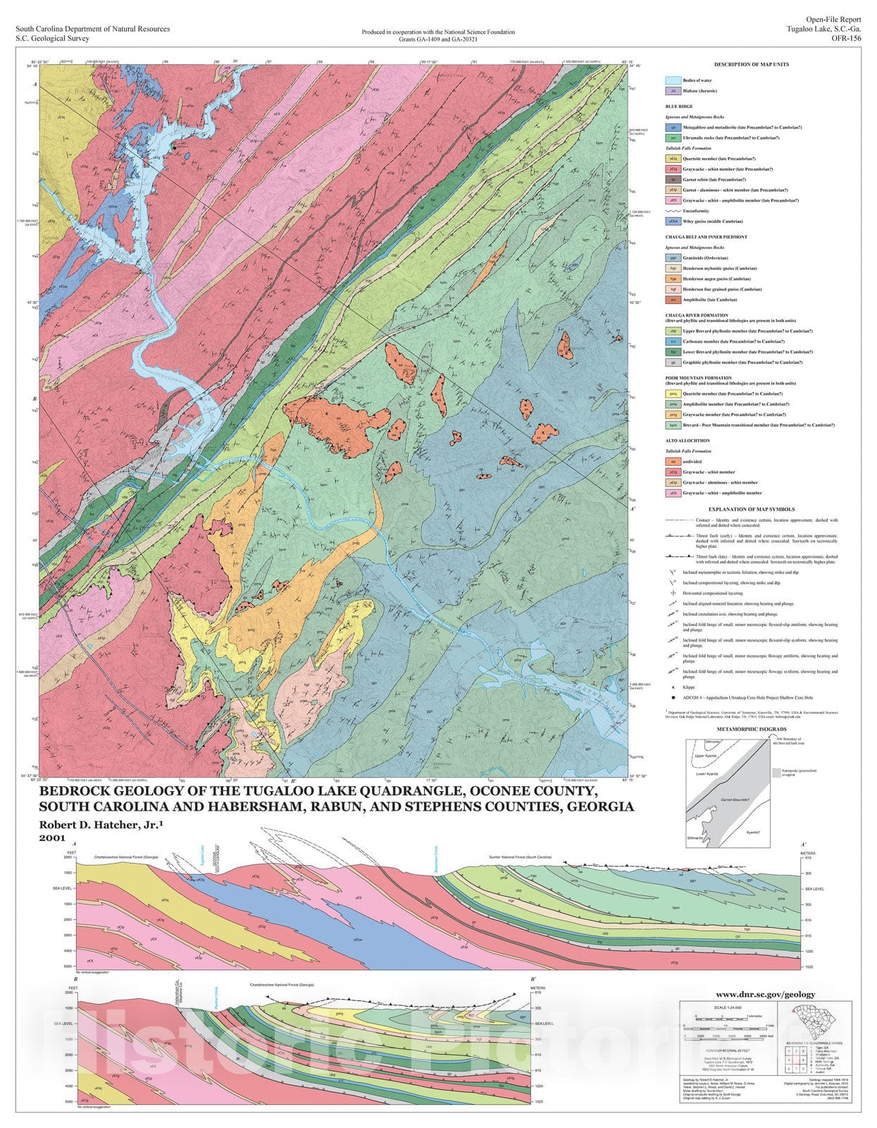 Map : Bedrock geology of the Tugaloo Lake quadrangle, Oconee County, South Carolina and Habersham, Rabun, and Stephens counties, Georgia, 2001 Cartography Wall Art :