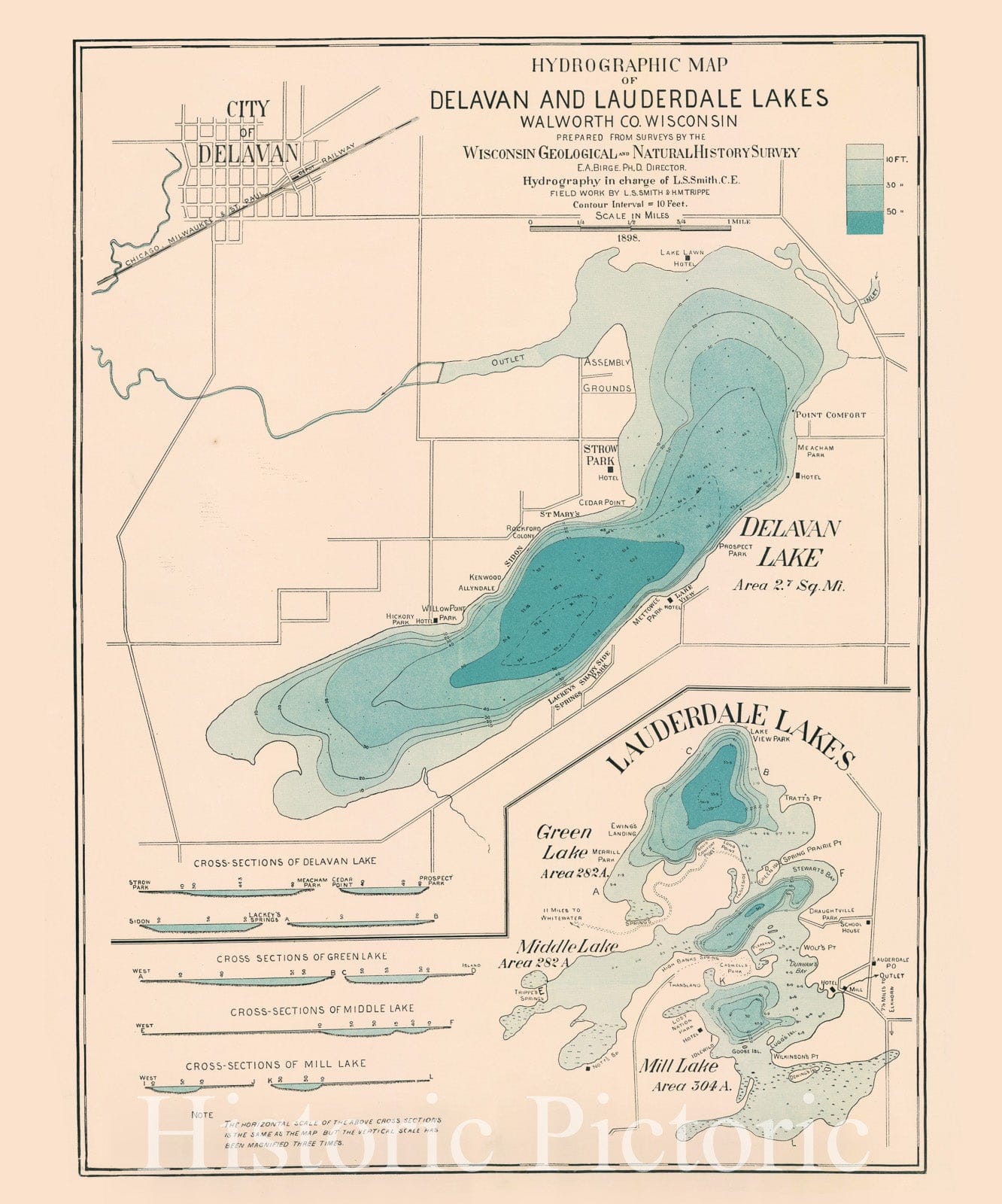 Map : Big Cedar Lake, Washington County, Wisconsin 1899, Hydrographic map of Big Cedar Lake, Washington County, Wis. , Antique Vintage Reproduction