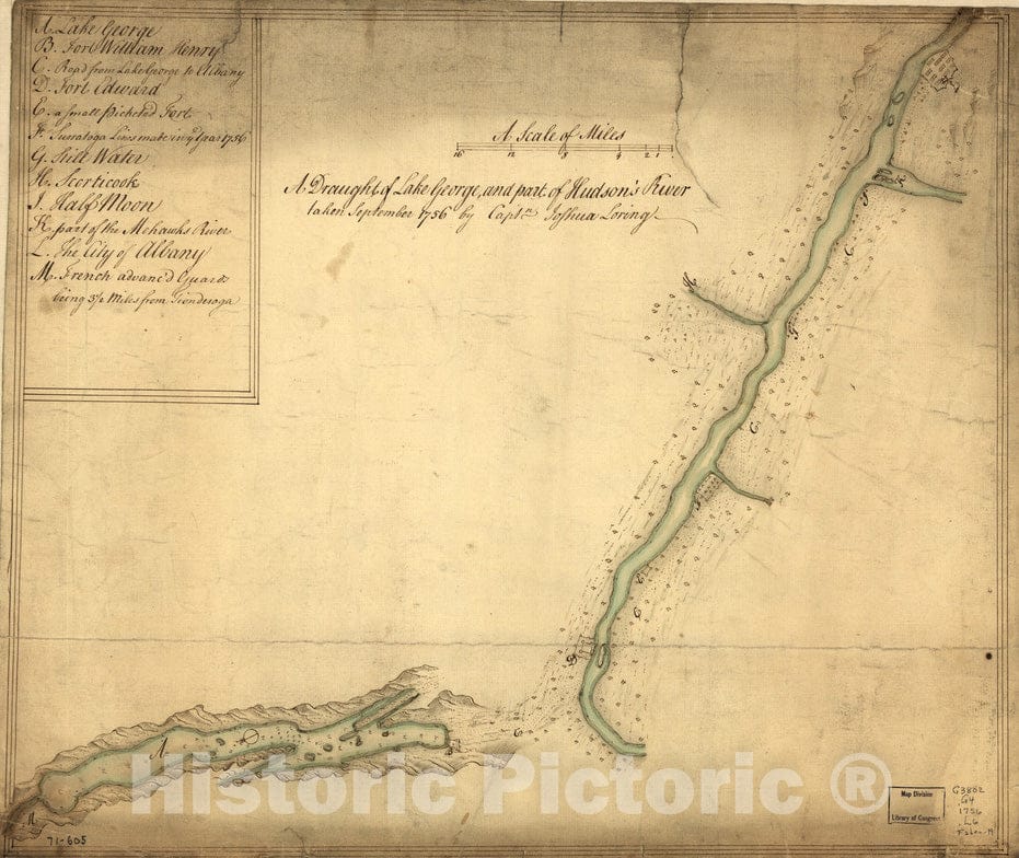 Historical Map, A Draught of Lake George, and Part of Hudson's River Taken September 1756, Vintage Wall Art