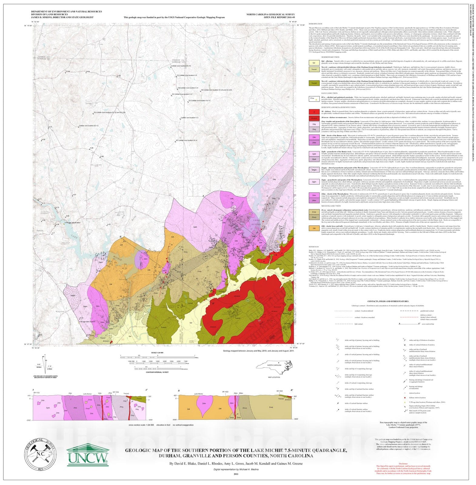 Map : Geologic map of the southern portion of the Lake Michie 7.5-minute quadrangle, Durham, Granville and Person Counties, North Carolina , 2011 Cartography Wall Art :