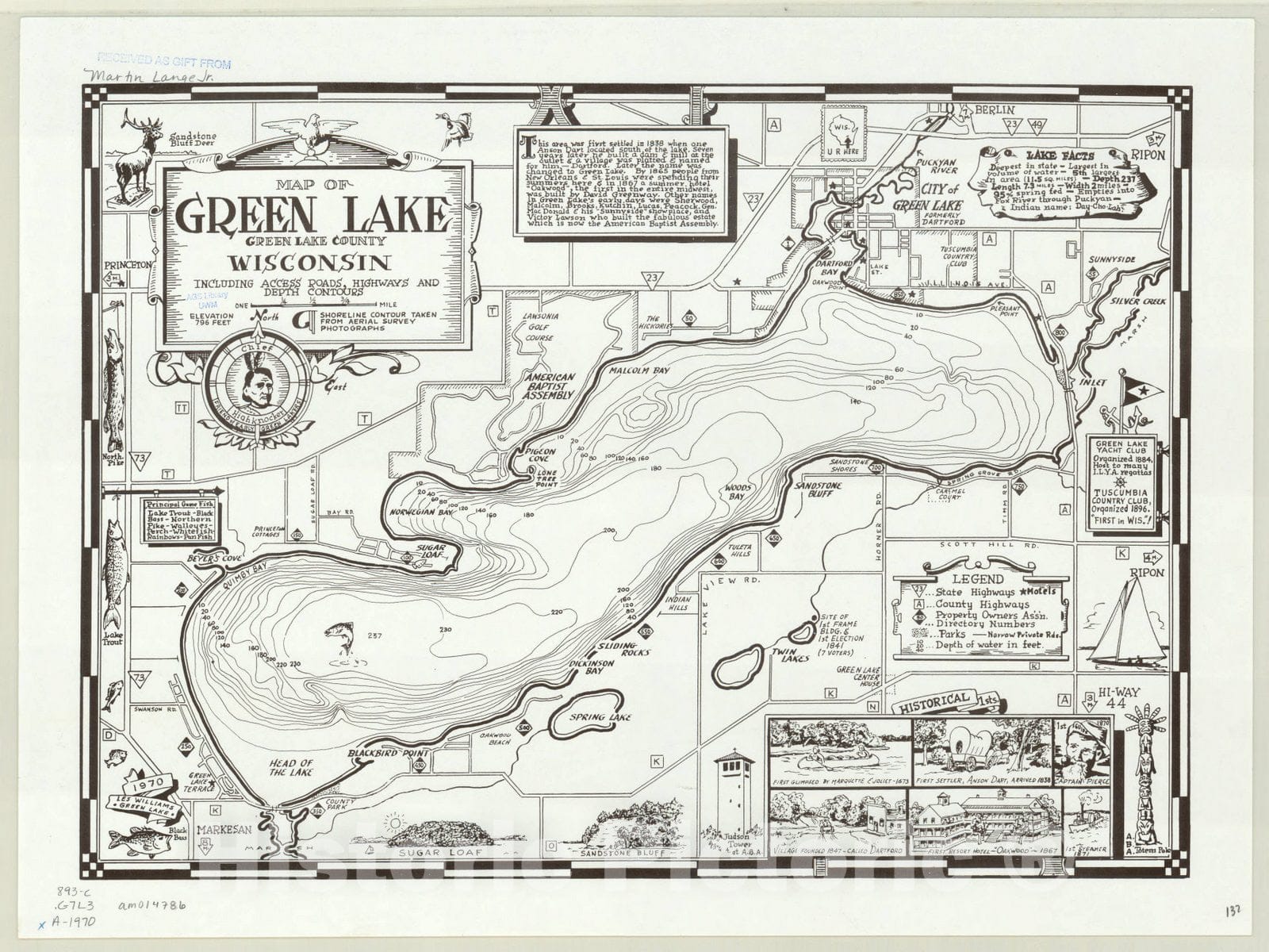 Map of Green Lake, Green Lake County, Wisconsin : including access roads, highways and depth contours / Les Williams