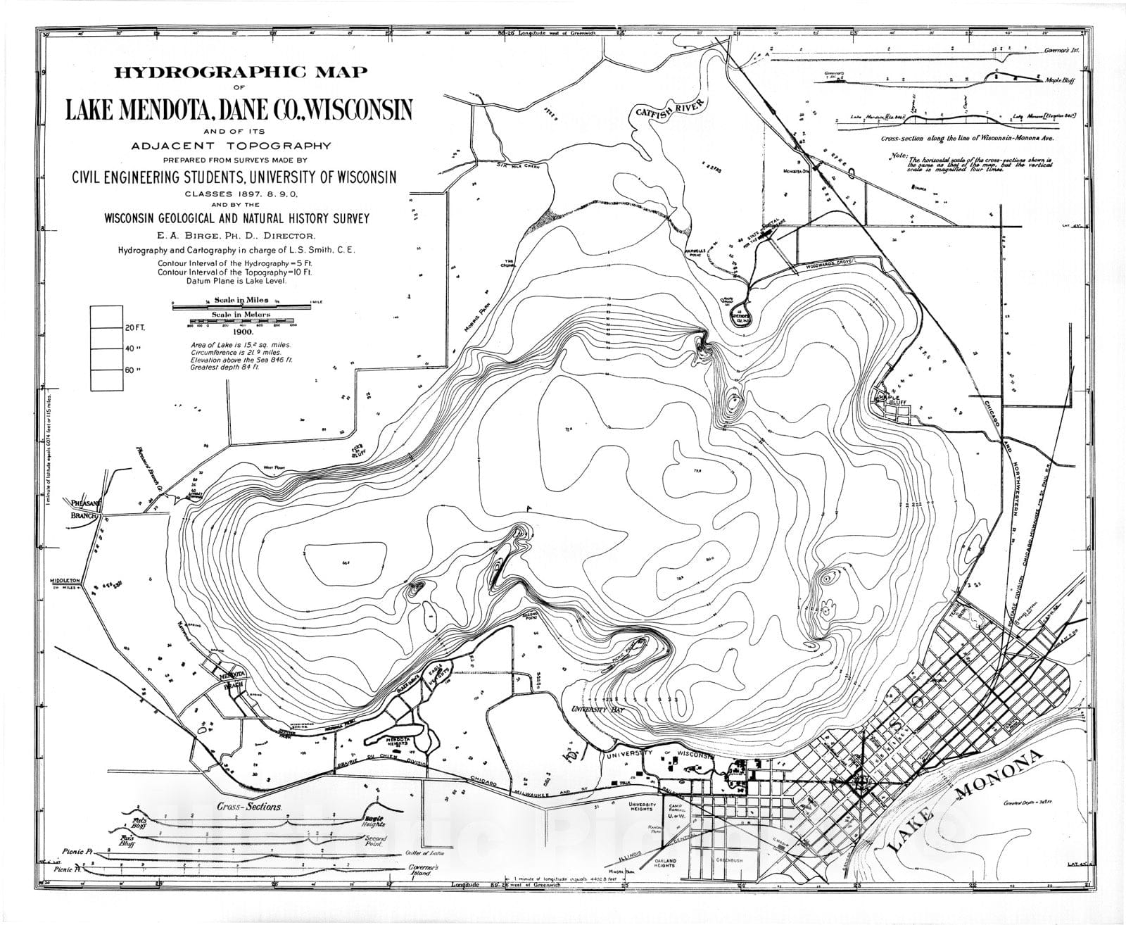 Map : Hydrographic Map of Lake Mendota, Dane County, Wisconsin, 1900 Cartography Wall Art :