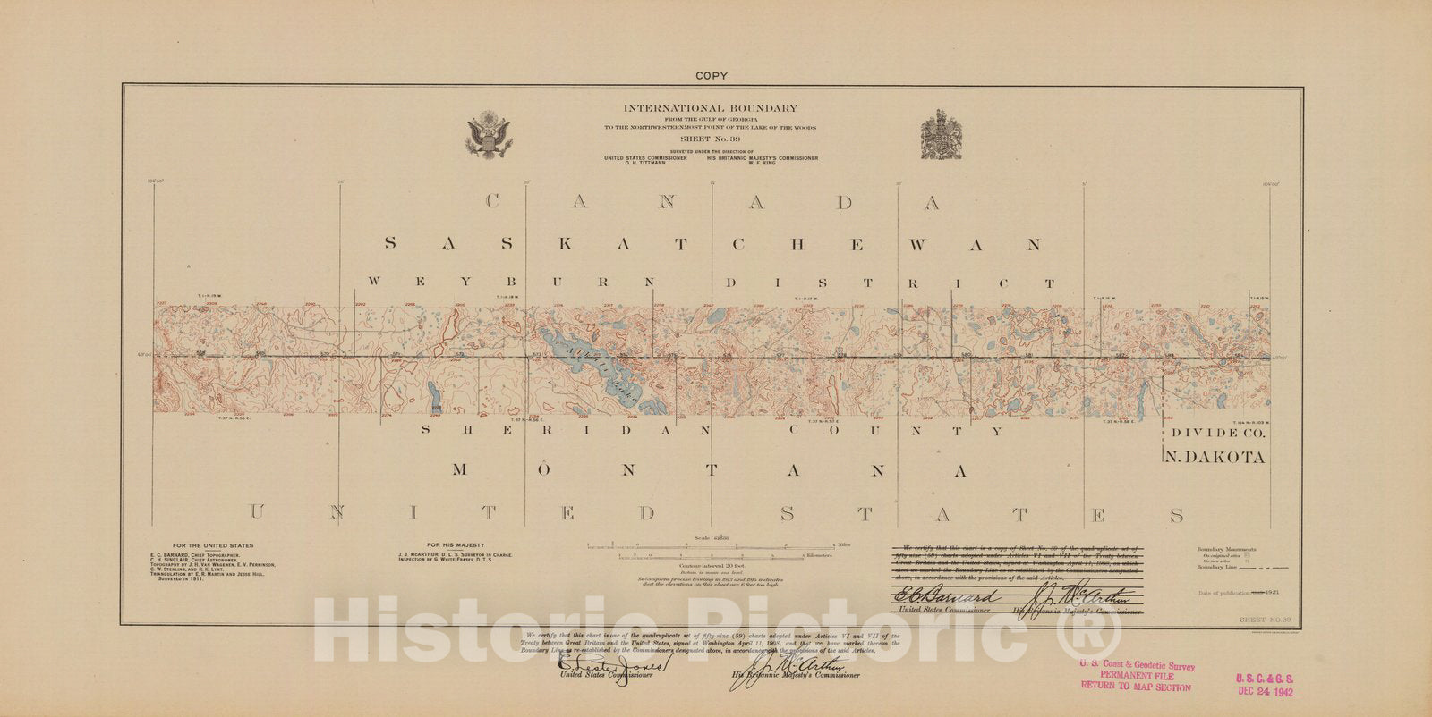 Historic Nautical Map - International Boundary, From The Gulf Of Georgia To The Northwestern Point Of The Lake To The Woods, Sheet No. 39, MT, ND, 1921 NOAA Topographic - Poster Wall Art Reprint - 0