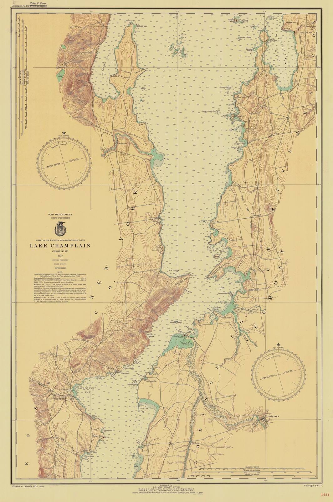 Historic Nautical Map - Lake Champlain, 1937 NOAA Chart - Vintage Wall Art