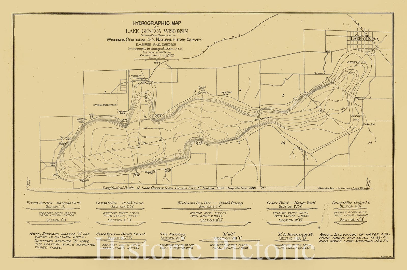 Map : Lake Geneva, Wisconsin 1898, Hydrographic map of Lake Geneva, Wisconsin , Antique Vintage Reproduction