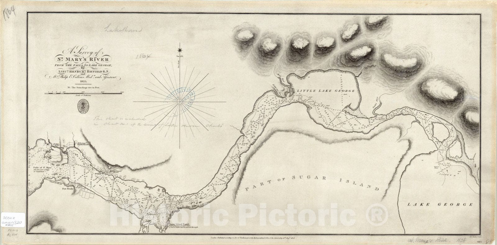 • .Map : Lake George 1825, A survey of St. Mary's River : from the falls to Lake George , Antique Vintage Reproduction