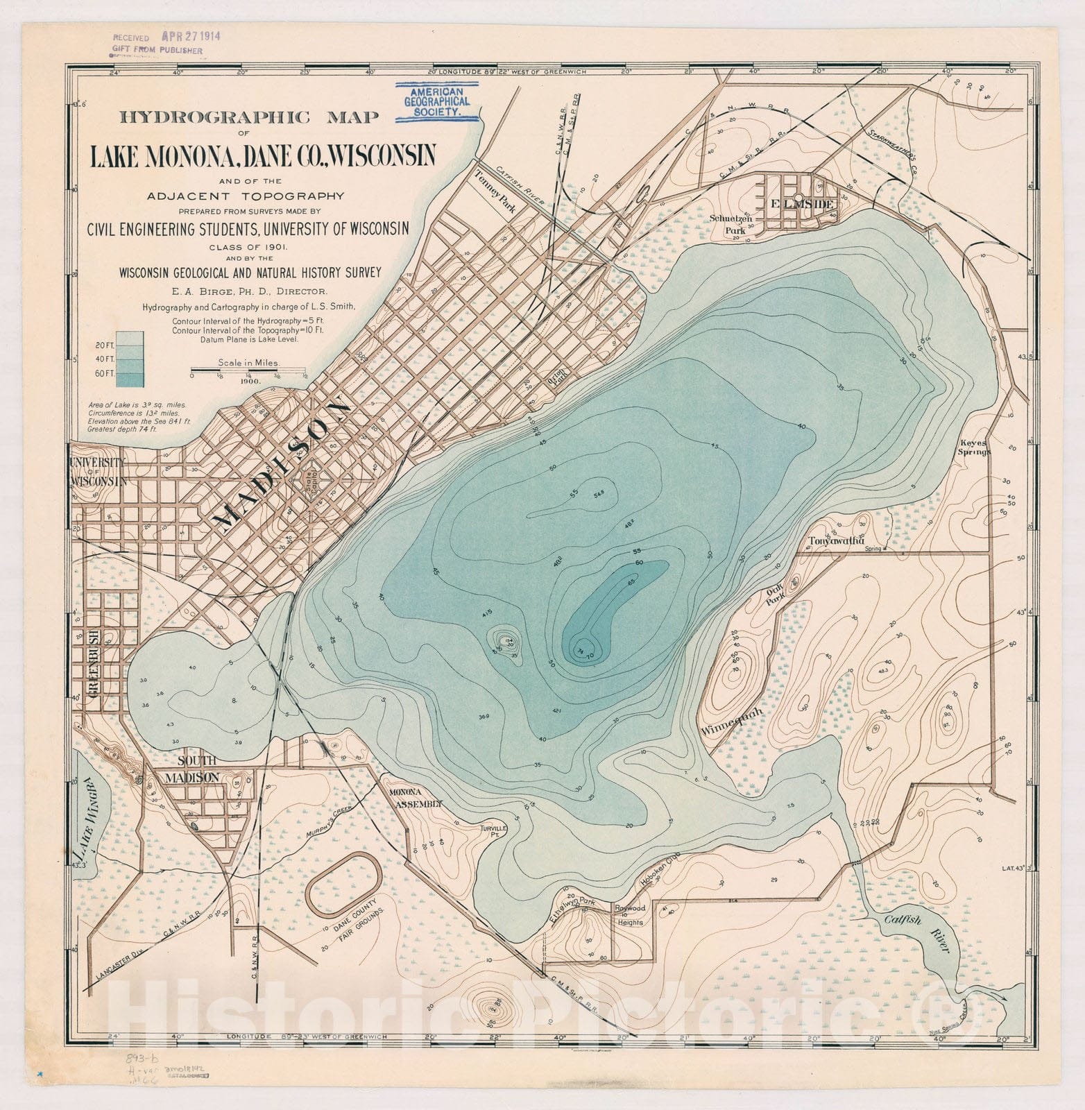 Hydrographic map of Lake Monona, Dane Co., Wisconsin and of the adjacent topography / prepared from surveys made by Civil Engineering Students, University of Wisconsin, Class of 1901, and by the Wisconsin Geological and Natural History Survey ; hydrogr