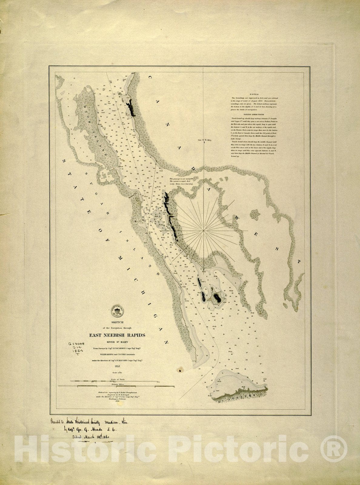 Map : Lake Survey Charts, Sketch of the navigation through East Neebish Rapids, River St. Mary, Antique Vintage Reproduction