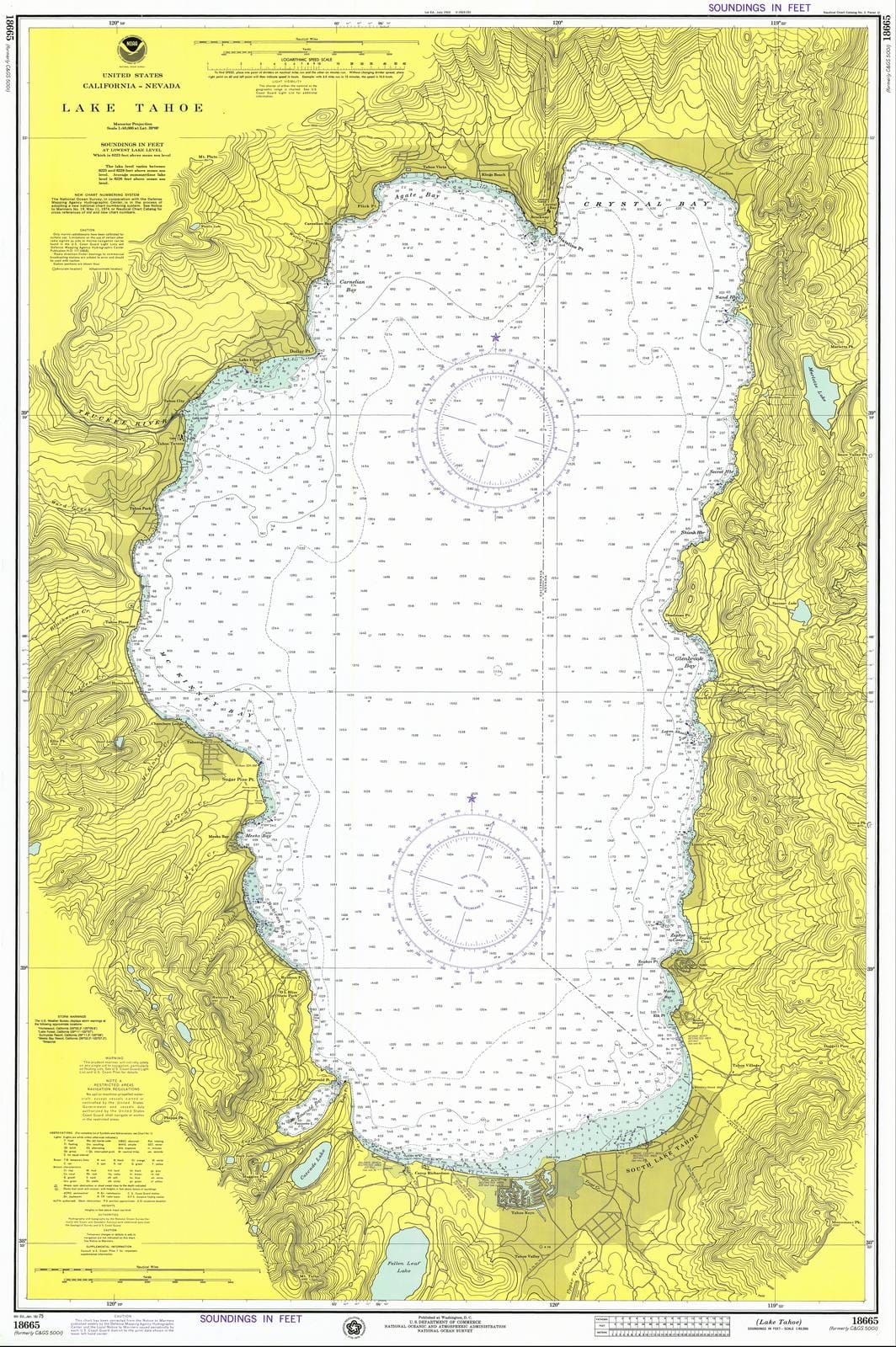 Historic Nautical Map - Lake Tahoe, NV, CA, 1975 NOAA Chart - Vintage Wall Art