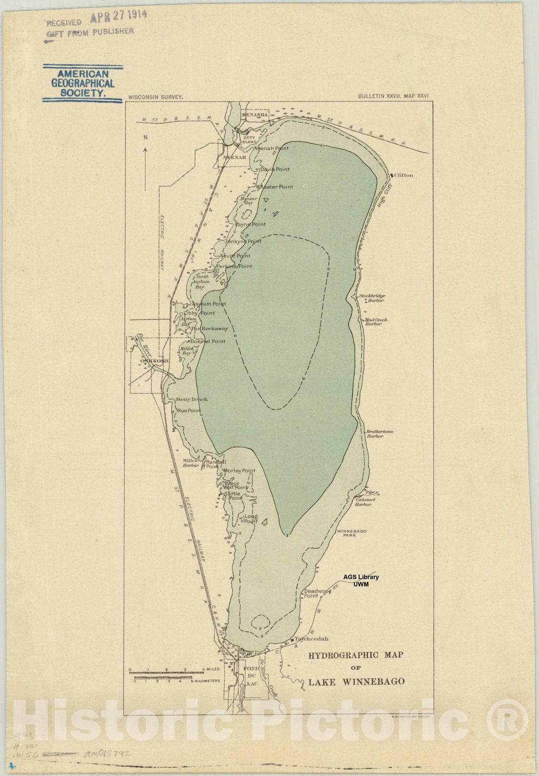 Map : Lake Winnebago, Wisconsin 1914, Hydrographic map of Lake Winnebago , Antique Vintage Reproduction