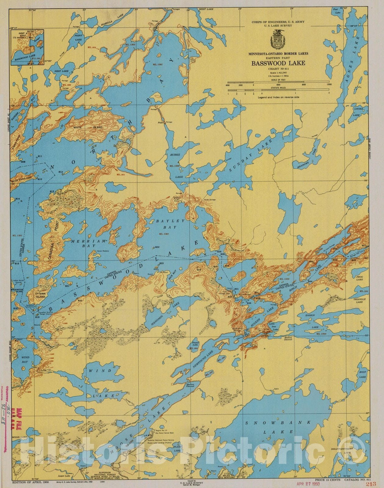 Historic Nautical Map - Minnesota-Ontario Border Lakes Eastern Part Basswood Lake, 1950 NOAA Chart - Vintage Wall Art