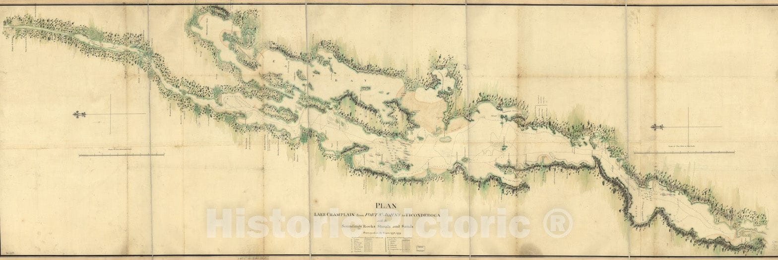 Historical Map, Plan, Lake Champlain from Fort St. John's to Ticonderoga : with The soundings, Rocks, Shoals, and Sands, surveyed in The Years 1778, 1779, Vintage Wall Art