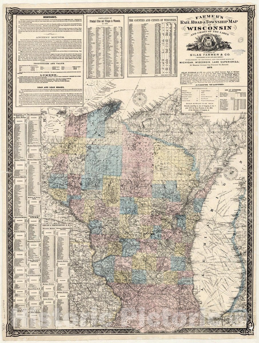 Map : Wisconsin 1872, Farmer's rail road & township map of Wisconsin and chart of the lakes , Antique Vintage Reproduction