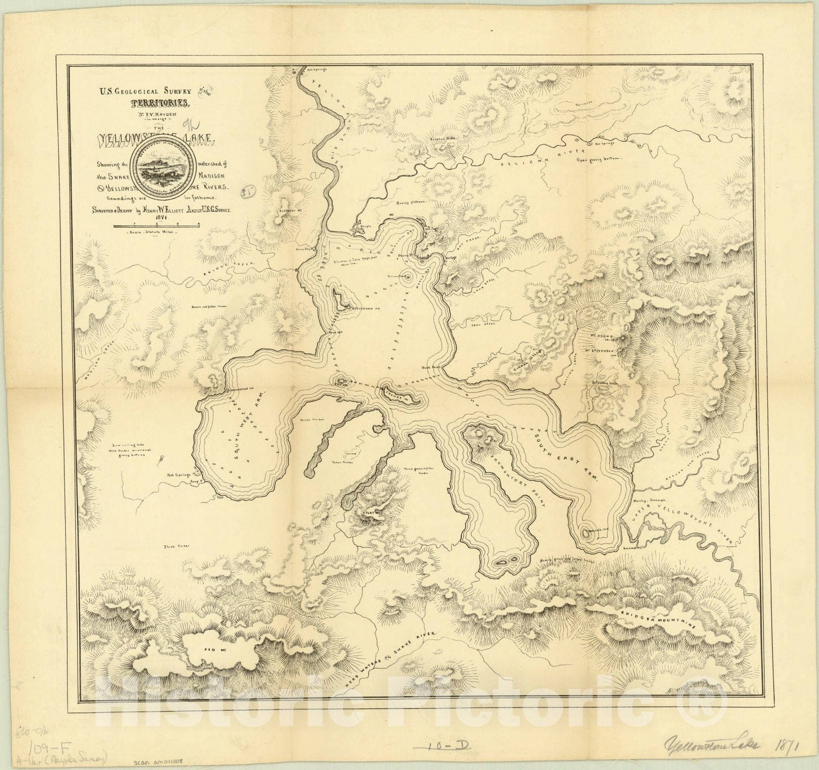 Map : Yellowstone Lake 1871, Yellowstone Lake showing the watershed of the Snake, Madison and Yellowstone Rivers , Antique Vintage Reproduction