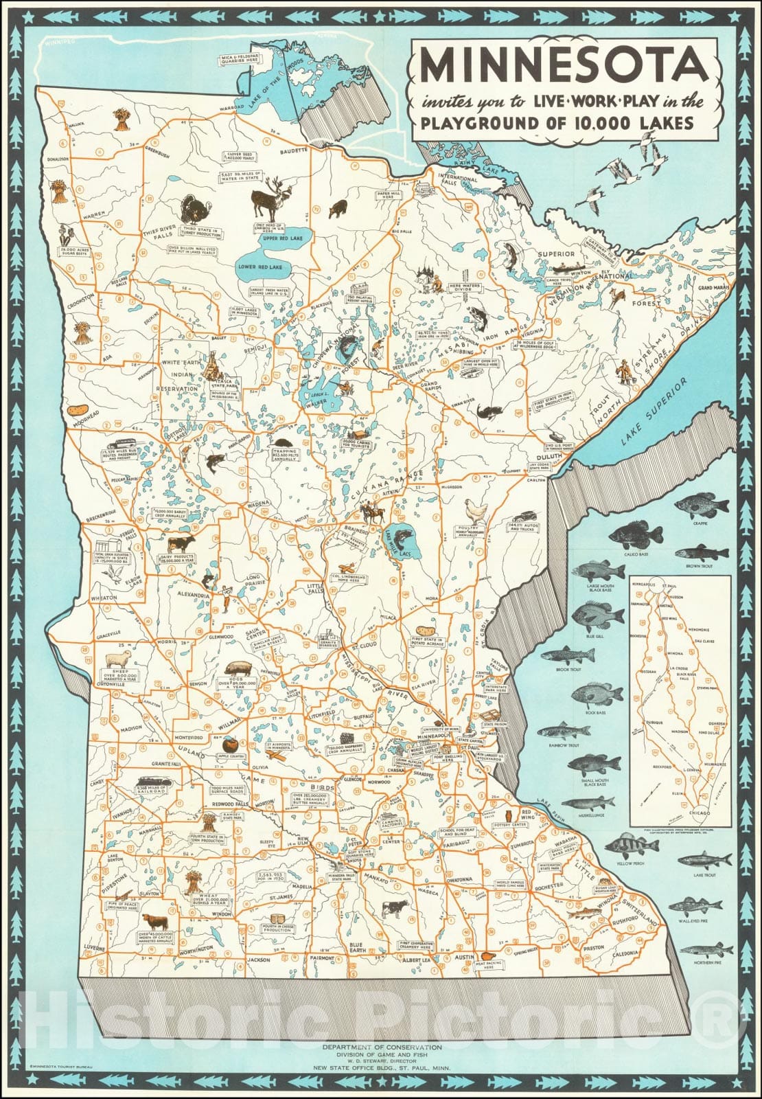 Historic Map : Minnesota invites you to Live-Work-Play in the Playground of 10,000 Lakes, 1935, Vintage Wall Art