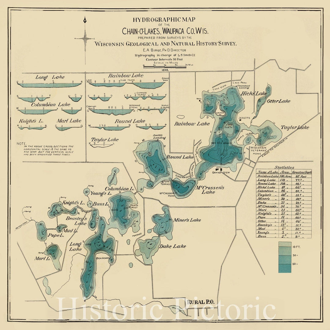 Map : Chain-O'-Lakes, Waupaca Co. Wisconsin 1899, Hydrographic map of the Chain-O'-Lakes, Waupaca Co. Wis. , Antique Vintage Reproduction