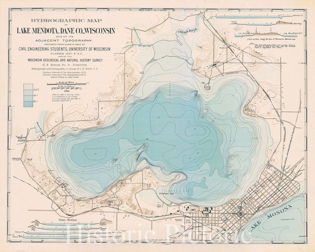 Map : Lake Mendota, Dane County, Wisconsin 1900, Hydrographic map of Lake Mendota, Dane Co., Wisconsin, and of its adjacent topography , Antique Vintage Reproduction
