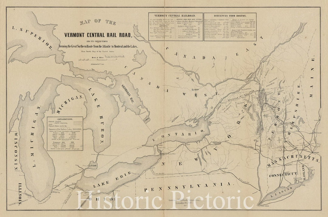 Historical Map, 1848 Map of The Vermont Central Rail Road and its Connections, Forming The Great Northern Route from The Atlantic to Montreal and The Lakes, Vintage Wall Art