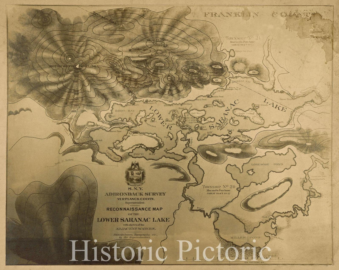Historic Map : Reconnaissance Map of the Lower Saranac Lake with sketch of the Adjacent Waters. Triangulation, Topography, etc. by the Superintendent., 1879 , Vintage Wall Art