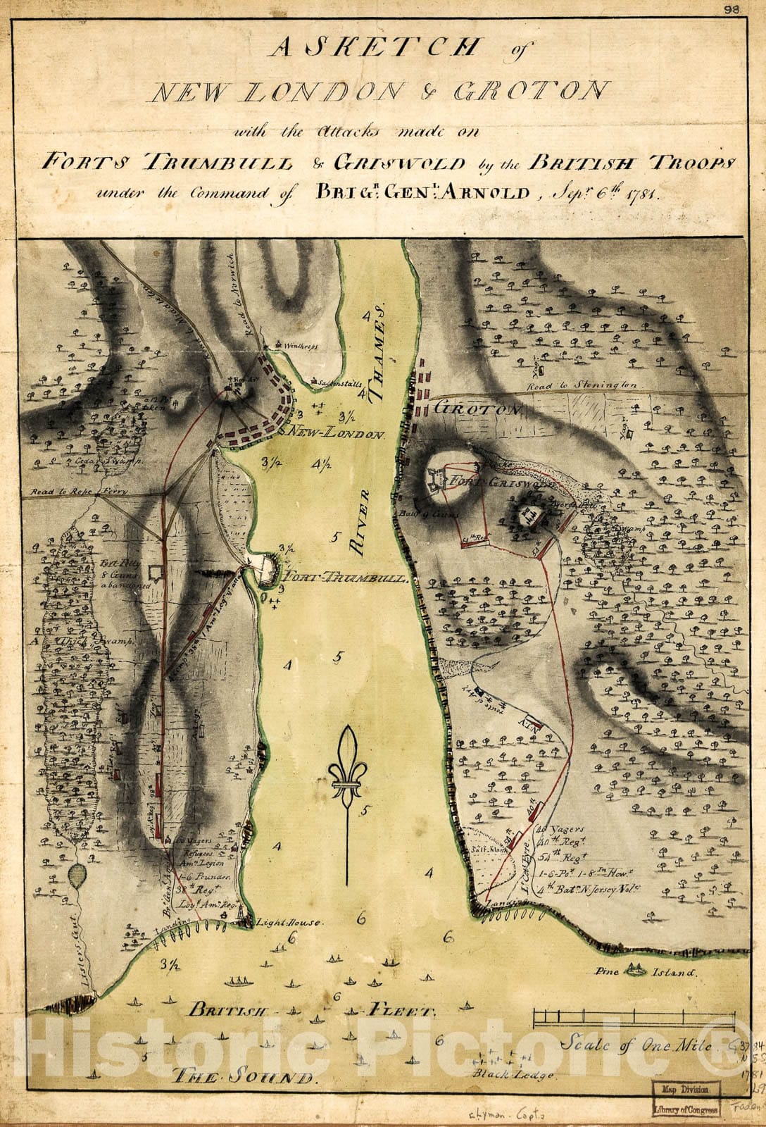 A sketch of New London & Groton with the attacks made on Forts Trumbull & Griswold by the British troops under the command of Brigr. Genl. Arnold, Sept. 6th. 1781.