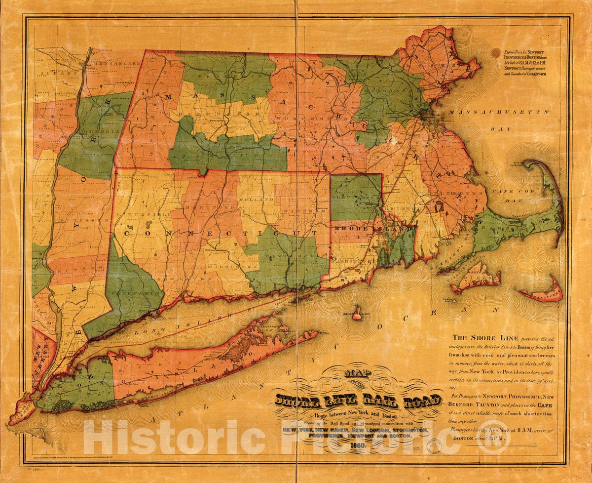 Historic 1860 Map - Map of The Shore Line Rail Road Route Between New York and Boston, Showing its Rail Road and Steamboat Connection with New York, New Haven, New London, Stonington