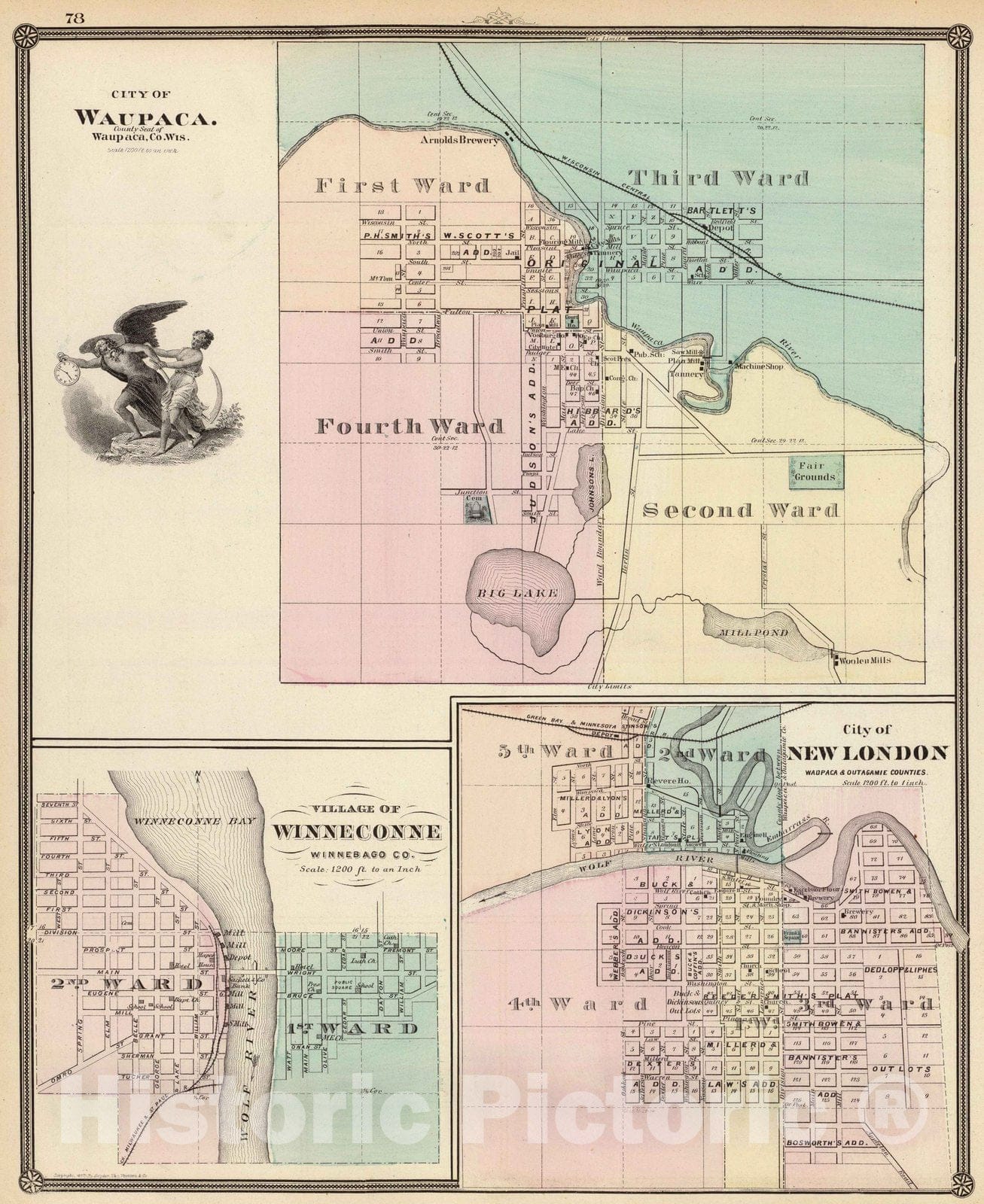 Historic Map : 1878 City of Waupaca, Village of Winneconne, City of New London. - Vintage Wall Art
