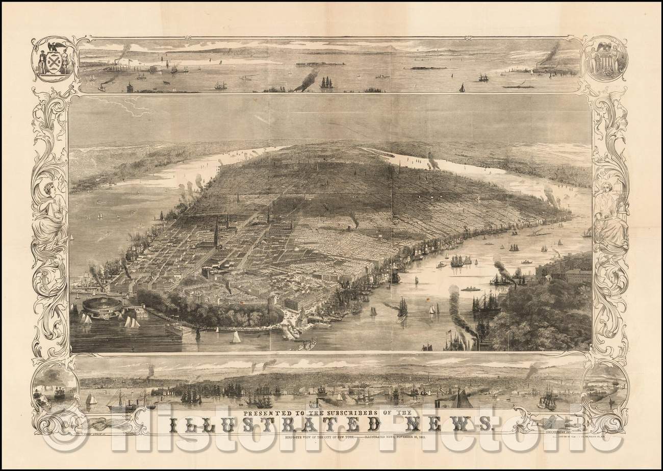 • .Historic Map - Bird's-Eye View of the City of New York, 1853, Illustrated London News - Vintage Wall Art