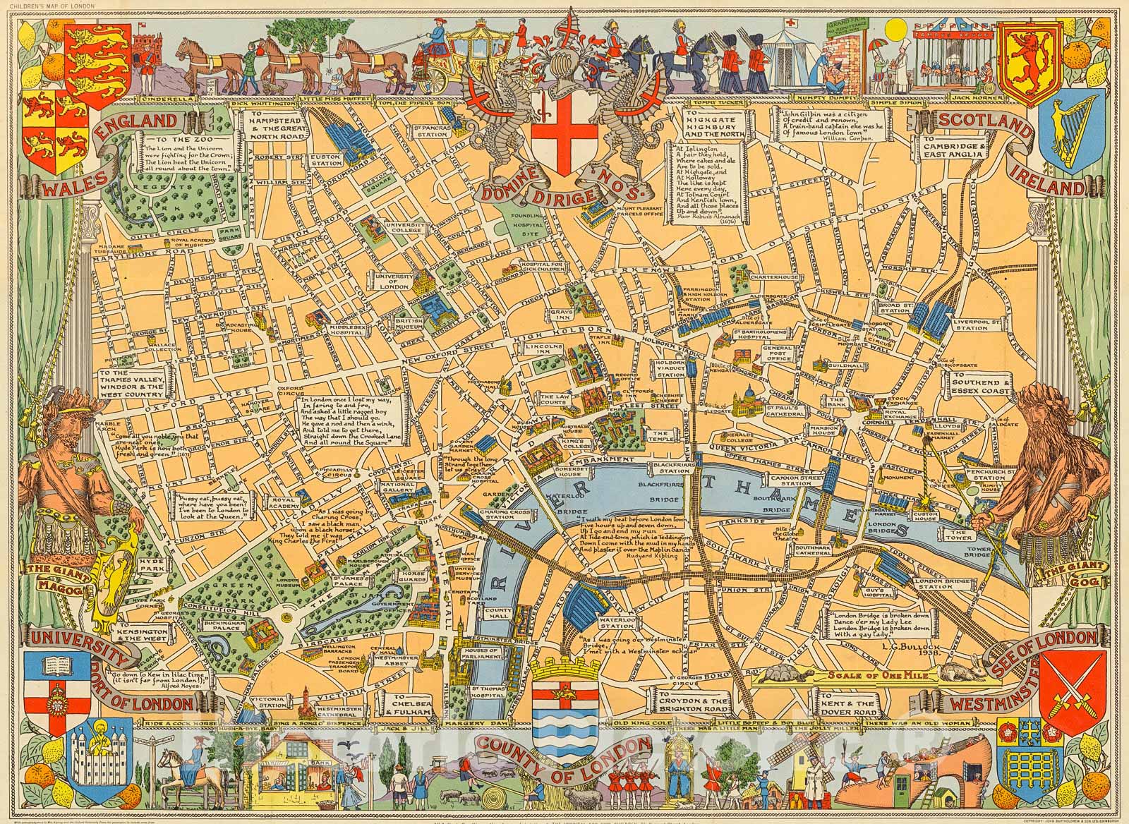 Historic Map : Children's Map of London. Printed and Published by John Bartholomew & Son Ltd., Edinburgh., 1938, Vintage Wall Decor