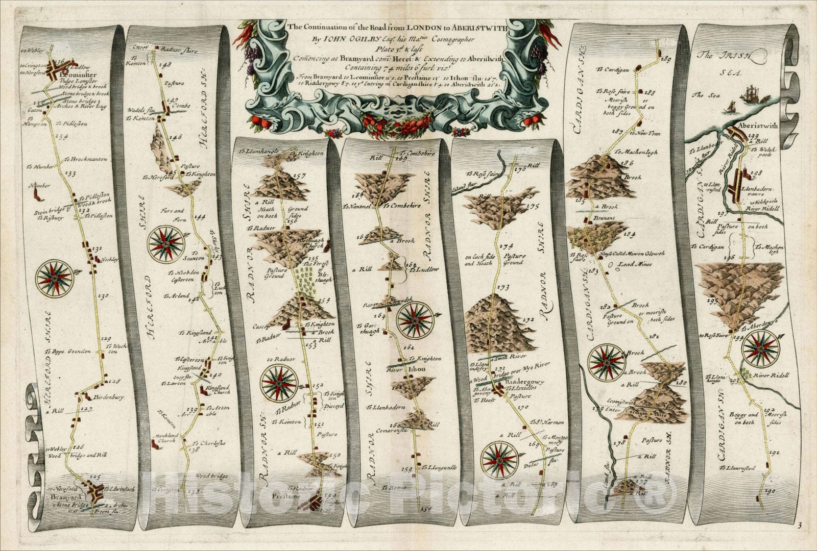 • .Historic Map : The Continuation of the Road from London to Aberistwith , 1675, , Vintage Wall Art