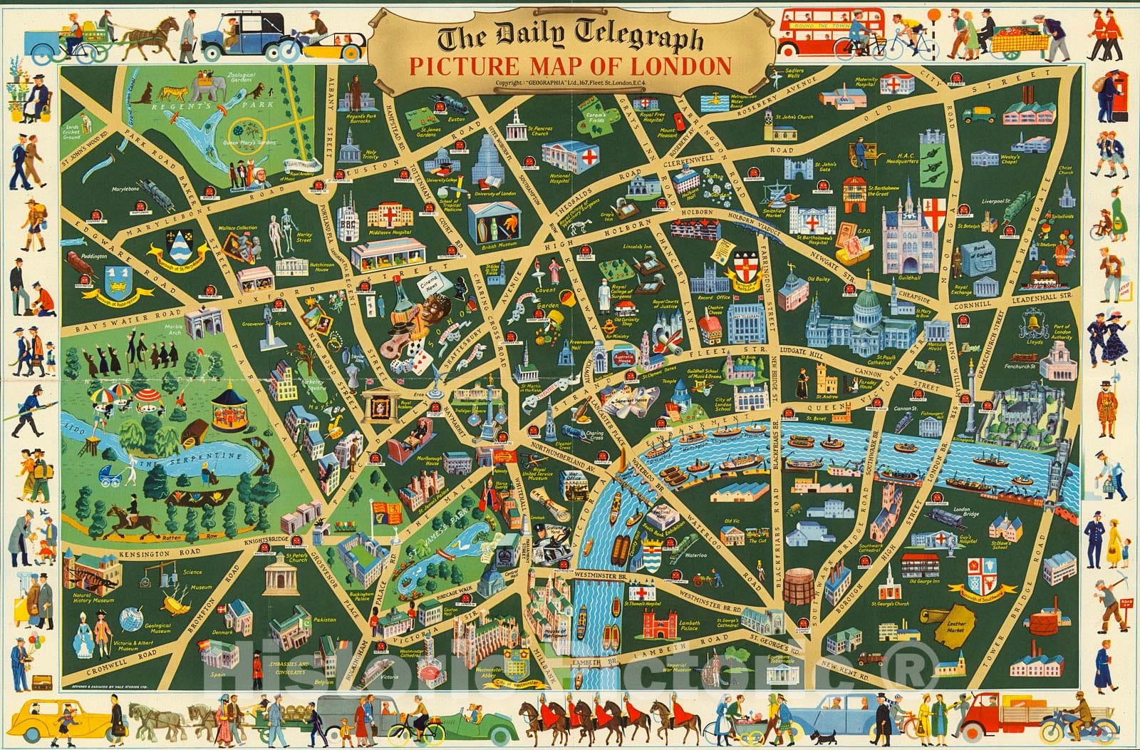 Historic Map : The Daily Telegraph Picture Map of London. With street plan of Central London., 1950, Vintage Wall Decor