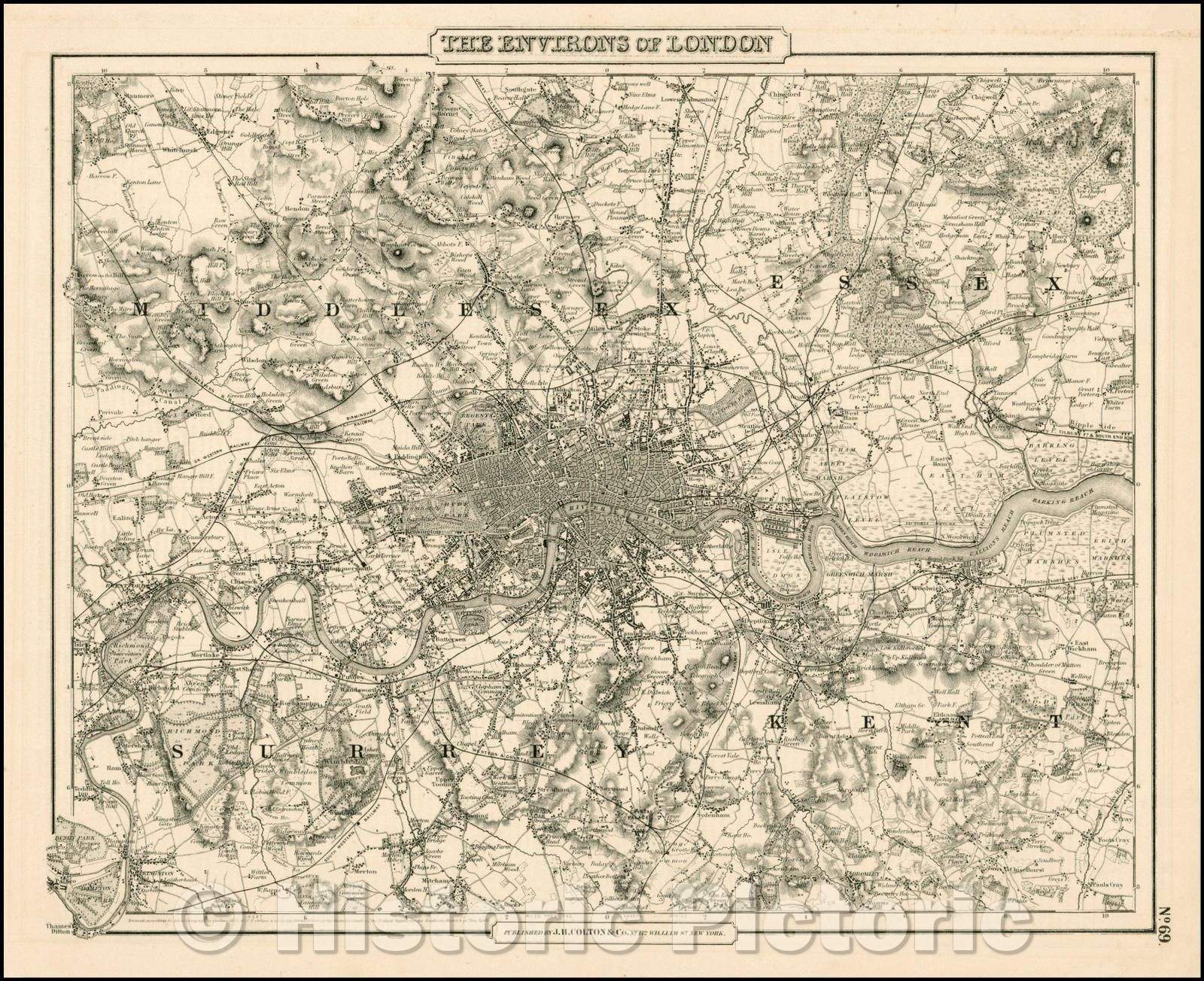 Historic Map - The Environs of London, 1864, Joseph Hutchins Colton - Vintage Wall Art